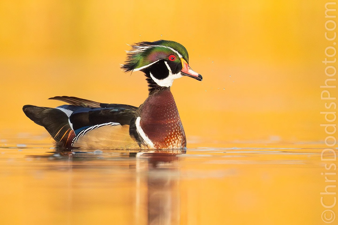 Molten Morning — Wood Duck (Aix sponsa, Canard branchu, Pato joyuyo, WODU) from my Better than Bosque workshop. Near Albuquerque, New Mexico, USA. Image Copyright ©Christopher Dodds. Sony a1 Mark III Mirrorless camera & Sony FE 600mm f/4 G Master OSS Lens with Sony FE 2X Teleconverter @1,200mm ISO 5,000, f/8 @ 1/3,200s. Full frame image. Manual exposure.